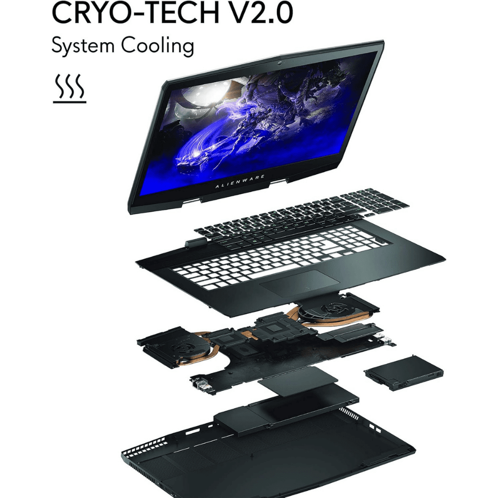 Performance remains cool and consistent thanks to Alienware Cryo-Tech v2.0 thermal technology, which allows CPU overclocking while maintaining optimal temperatures. The advanced cooling system features dual-intake and dual-exhaust airflow, high-voltage driving fans with ultra-thin blades, load-balancing copper heat pipes, and copper fin stacks that efficiently dissipate heat. This ensures both the CPU and GPU operate at peak performance during intense gaming sessions.