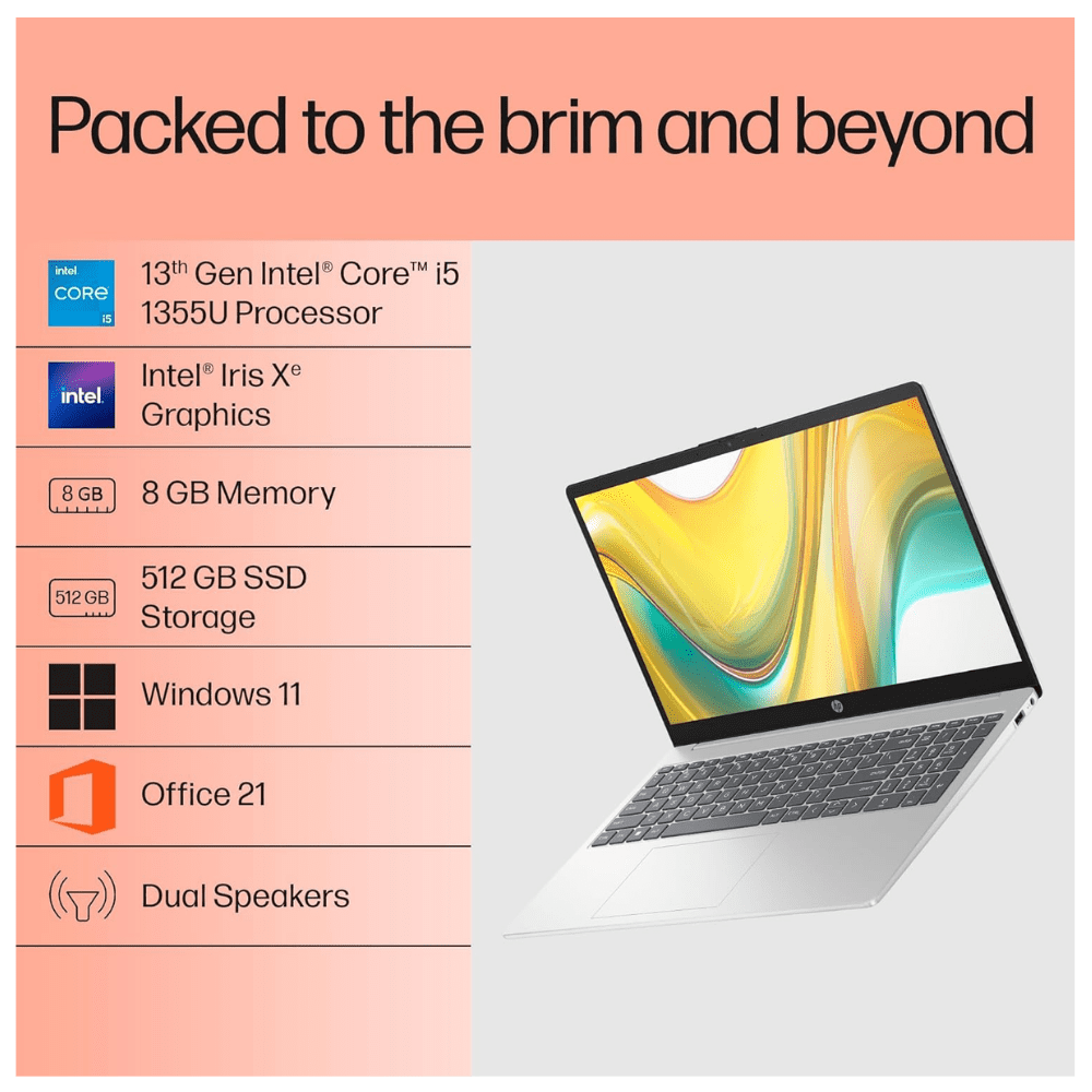 HP Refurbished Notebook Laptop 15 fd0011TU | 13th Gen Intel Core i5-1335U | 15.6” FHD Display | 8GB DDR4 RAM | 512GB SSD | Intel Iris Xe Graphics | Windows 11 + MS Office 2021 | Silver